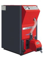 Мощность 20 кВт. КПД 95%. Отапливаемая площадь 180м². Комплект поставки — котел, пеллетная горелка ATMOS A25, шнековый транспортер, бункер